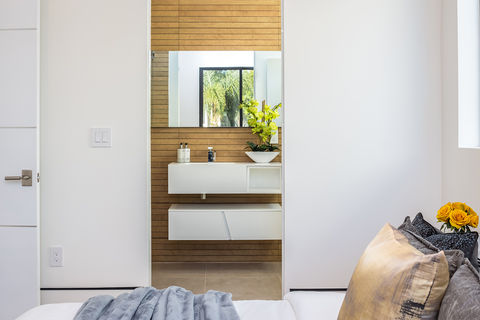 At the top of the statement-making staircase, a second level boasts an open floor plan with a light-filled living area enhanced by a backlit floating ceiling and sliding pocket doors to an outdoor lounge. Two en-suite guest rooms are spacious and bright, each featuring designer bathrooms, walk-in closets, and generous balconies. A sophisticated master suite is complete with a fireplace, wet bar, fully modular showroom closet, and gorgeous bathroom with Porcelanosa Krion countertops, a double shower, and soaking tub.